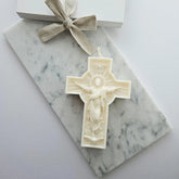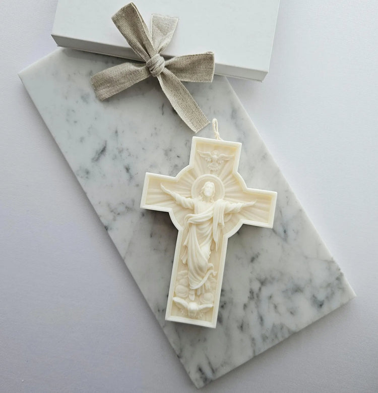 Esta hermosa vela en forma de cruz impresiona por su diseño minimalista. Es perfecta como decoración simbólica para ocasiones especiales como bautizos y comuniones, o como un adorno sencillo y elegante para el hogar o como regalo de Pascua. ✨️